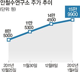 4일 코스닥시장에서 안철수연구소 주가는 15만9900원으로, 안 원장의 기부선언이 있던 작년 11월14일 8만1400원에 비해 두 배 가까이 올랐다.