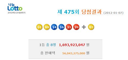 7일 저녁 그 주인공이 가려졌다. 2012년 첫 번째 나눔로또 제475회 당첨결과, 로또 1등 당첨번호는 `1, 9, 14, 16, 21, 29' 보너스 3번이다.