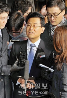 | 高의 수첩에 적힌 내용은… 한나라당 전당대회 돈봉투 사건을 폭로한 고승덕 의원(가운데)이 8일 오후 서울 서초구 서초동 서울중앙지검으로 출두해 조사를 받기 전 취재진 질문에 답하고 있다. 이재문 기자 |