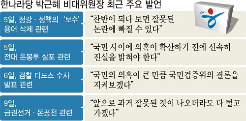 박근혜 비대위원장은 비대위 회의에서 돈봉투 사건에 대해 “국민 앞에 한점 의혹 없이 철저히 밝힐 것이고 앞으로 과거의 잘못된 부분이 나오더라도 다 털고 갈 것”이라고 밝혔다.