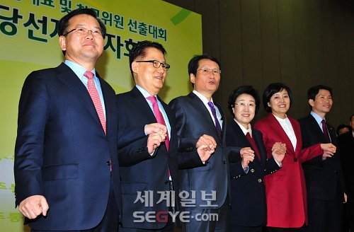 | 15일 경기 고양시 킨텍스에서 열린 민주통합당 전당대회에서 선출된 한명숙 신임 대표(오른쪽 세번째)와 최고위원들이 손을 잡고 인사하고 있다. 왼쪽부터 김부겸·박지원·문성근 최고위원, 한 대표, 박영선·이인영 최고위원. 고양=김준범 기자 |