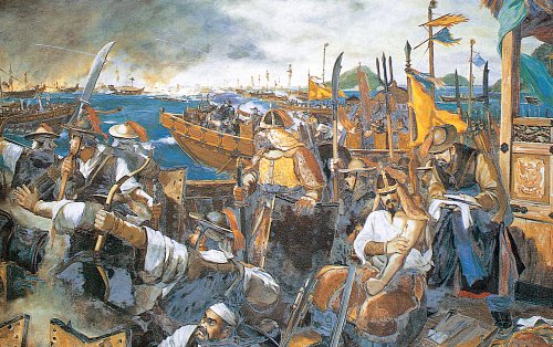 | 임진왜란을 조선의 승리로 이끄는 데 결정적 기여를 한 거북선이 처음 출동한 사천해전 기록화. 바다의 전쟁을 진두지휘한 이순신 장군에 대해서는 일본에서도 영웅으로 평가한다. |