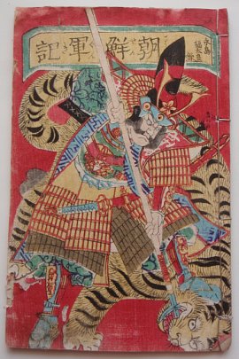 | 임진왜란 당시 왜의 장군인 가토 기요마사가 조선의 호랑이를 창으로 사냥하는 그림인 조선군기(朝鮮軍記)로 19세기에 간행됐다. 호랑이로 상징되는 조선의 무력을 가토 기요마사가 누른다는 상징적인 장면을 담았다. |