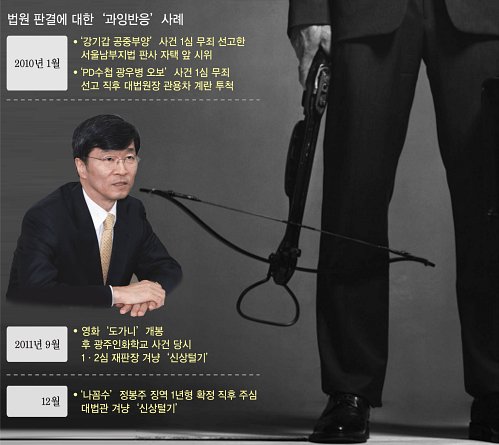 요즘 법원을 괴롭히는 건 이뿐만이 아니다. 2007년 판결에 불만을 품고 담당 재판장에게 ‘석궁테러’를 한 김명호 전 성균관대 교수의 실화를 다룬 영화 ‘부러진 화살’은 사법부를 정조준했다. 영화는 재판부의 혈흔 감정 기각, 증인 채택 기각 등을 부각시켜 평소 ‘법원이 부조리하다’고 생각하는 시민들로부터 호응을 얻으며 흥행몰이를 하고 있다. 법원은 이 영화가 사법부와 법관에 대한 국민적 공분을 불러일으킨 영화 ‘도가니’의 재판이 될까 바짝 긴장하는 눈치다. 사법부는 지난해 9월 ‘도가니’ 열풍 때에 이어 또 관련 판사의 ‘신상털기’로 한바탕 홍역을 치렀다.