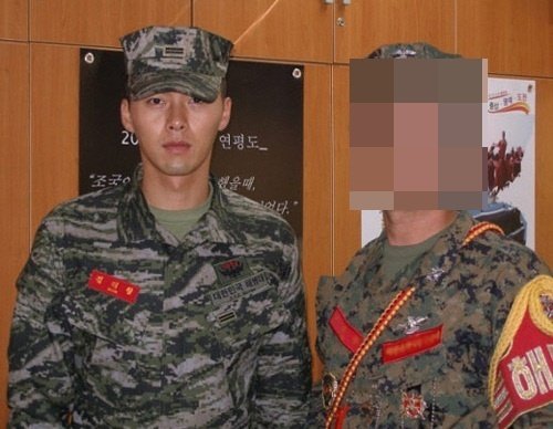 사진 속 현빈은 국방색 내복 위에 군복을 입고 간부로 추정되는 사람과 긴장한 듯한 표정으로 카메라를 바라보고 있다.