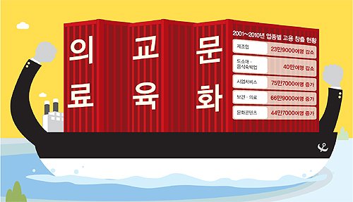 기획재정부에 따르면 2001년부터 2010년까지 고용 창출 인원은 총 225만7000여명이었는데 그중 사업서비스 75만7000여명, 보건의료 66만9000여명, 문화콘텐츠 44만7000여명 증가했다. 반면 제조업은 23만9000여명, 도소매·음식숙박업은 40만여명 감소한 것으로 조사됐다. 일반적으로 고용 창출 효과가 큰 것으로 평가됐던 업종은 효과가 크지 않았고, 서비스 관련 사업의 경제 기여도가 컸다.