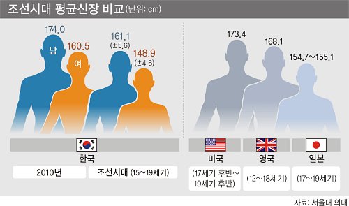 서울대 의대 해부학교실 황영일·신동훈 교수팀은 15세기 이래 19세기에 이르기까지 조선시대 116명(남 67명, 여 49명)의 유골에서 채취한 넙다리뼈(대퇴골)를 이용해 평균키를 분석한 결과 남성은 161.1(±5.6)㎝, 여성은 148.9(±4.6)㎝로 각각 분석됐다고 31일 밝혔다. 이는 2010년 지식경제부 기술표준원이 조사한 한국인 평균키(남 174㎝, 여 160.5㎝)에 비해 각각 12.9㎝, 11.6㎝가량 작은 수치다. 이 연구결과를 담은 논문은 미국 자연인류학저널(American Journal of Physical Anthropology) 최신호에 실렸다.