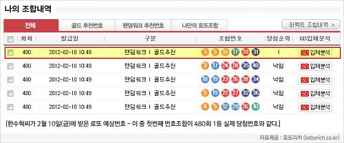 한 씨의 아이디로 올린 인터넷 후기는 후회와 안타까움으로 가득차 있었다. 한 씨는 해당 로또정보 제공업체에 2011년 2월 12일에 유료회원으로 가입한 후 정확히 1년 만에 그토록 원하던 로또 1등 번호를 받았다.
