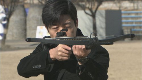 | 석궁 발사를 재연하고 있는 진행자 김상중. SBS제공 |