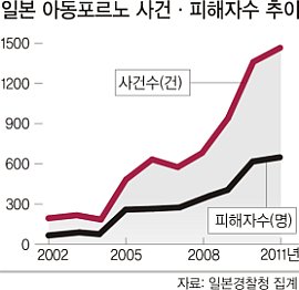 19일 NHK에 따르면 일본 경찰청은 2011년 적발한 아동포르노 제작 및 판매 관련 사건이 총 1455건을 기록, 종전 최고 기록이었던 2010년 1342건을 뛰어넘었다고 발표했다. 또한 아동포르노 촬영 등으로 피해를 본 아동수(18세 미만)도 확인된 것만 638명에 달해 역대 최고를 기록했다. 경찰청이 관련 통계를 집계하기 시작한 2000년에는 적발건수가 170건, 피해자는 123명에 불과했지만 해마다 빠르게 증가하고 있다.