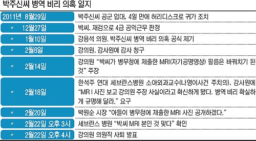이번 논란의 핵심은 강 의원이 공개한 MRI가 박 시장 아들의 것이냐 여부다. 강 의원은 주신씨가 지난해 12월 허리디스크로 4급 판정을 받아 병역을 면제받을 때 병무청에 제출한 자료가 바꿔치기 됐다는 의혹을 제기했다. 이날 주신씨의 MRI 촬영과 판독에는 세브란스병원 신경외과 윤도흠 교수, 정형외과 이환모 교수, 신경영상의학과 이승구 교수 등이 참여했다.