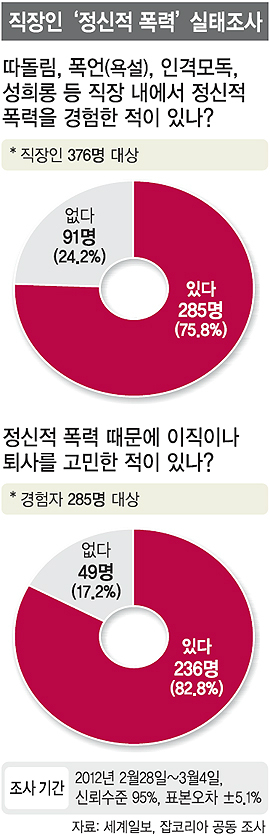폭력이 진화하고 있다. ‘물리적 폭력’이 사라진 조직은 겉으로보면 평화로워보이지만 내부에는 교묘하고 은밀한 ‘정신적 폭력’이 꿈틀대고 있다. 전문가들은 이를 ‘풍선효과’라고 설명한다. 물리적 폭력이 통용되지 않는 분위기에서 폭력은 그 모습을 바꿔 ‘조직원을 통제하기 위한 수단’으로서 끊임없이 존재한다는 것. 조직 구석구석까지 파고든 정신적 폭력은 조직원들을 순응시키고 이에 반기를 드는 이들에게는 ‘부적응자’라는 낙인을 찍어 조직에서 걸러낸다. 취재팀은 직장인 10명을 심층 인터뷰해 그들이 느끼는 직장내의 정신적 폭력에 대해 알아봤다. 취업포털사이트 ‘잡코리아’의 협조를 얻어 직장인 376명을 상대로 설문조사도 진행했다.“한 직장상사는 ‘너는 에미애비도 없냐, 돼먹지 못한 놈’이라고 저주를 퍼부어요. 어머니가 얼마 전에 돌아가신 걸 분명히 알고 있으면서 말이죠….”A(32)씨는 매일 출근길이 두렵다. 자신에게만 폭언과 욕설을 퍼붓는 상사와 부대껴야 하기 때문이다. 소규모 작업장이라 딱히 피할 곳도 없다. A씨는 “어느날 일감이 밀려 철야를 하고 나서, 출근하는 상사에게 ‘이렇게 일이 쌓였는데 나몰라라 가시면 서운하다’고 말했는데 그 후로 내가 공격 대상이 됐다”며 “그 바람에 스트레스가 쌓여 불면증까지 생겼다”고 토로했다.취재진이 만나 본 직장인들은 대부분 한 가지 이상의 정신적 폭력에 시달리고 있었다. 가해자는 대부분 상사였다. 심한 스트레스를 받으면서도 문제 제기하는 경우는 드물었다. 더 심한 폭력과 괴롭힘에 시달릴 것이라는 두려움, ‘부적응자’라는 낙인이 찍힐지도 모른다는 공포가 이들을 주저하게 만들었다.클릭하면 큰 그림을 볼 수 있습니다◆“돼지 같은 X, 나는 너를 사람으로 안 본다”언어폭력은 직장에서 경험하는 대표적인 정신적 폭력이다. B(26·여)씨는 선배의 욕설을 견디지 못하고 입사 1년도 채 안 돼 사직서를 냈다. 선배는 “더워 죽겠는데 왜 에어컨도 안 틀어놨냐 XXX야” 등 사소한 일로 트집을 잡아 욕설을 쏟아내곤 했다. A씨는 “나한테는 ‘사수’ 역할을 했던 선배인데 욕을 입에 달고 살았다”며 “그를 보기만 해도 가슴이 두근거리고 손이 떨릴 정도인데 주변에서는 대수롭지 않게 여기는 게 더 충격적이었다”고 하소연했다.이 같은 언어폭력은 학력·외모 비하에서부터 인격 모독적 발언, 직접적인 욕설까지 다양한 방식으로 이뤄진다. C(30·여)씨는 상사에게 “돼지야, 난 너를 사람으로 안 봐”라는 욕을 먹고 사과를 요구했지만 묵살당했다. D(32)씨는 “실수할 때마다 ‘XX대학 나온 놈들은 다 그러냐’며 폭언을 일삼는 선배 때문에 주먹을 꽉 쥐고 부르르 떤 적이 한두 번이 아니다”고 털어놨다.◆회식 땐 상사의 접대부회식은 직장 내 상하관계에서 비롯되는 폭력성이 적나라하게 드러나는 자리다. 신입사원 E(27·여)씨는 “2차로 노래방을 가면 연차가 낮은 사원들은 무조건 노래 부르고 춤을 춰야 한다”며 “가끔 상사들이 노래 잘한다며 용돈을 찔러줄 때면 마치 접대부가 된 것 같은 기분이 든다”고 말했다.F(29)씨는 “1차에서는 맥주컵에 소주를 따라서 원샷을 시키고, 2차로 노래방에 갈 때는 평사원들을 골목마다 배치해 놓고 ‘상무님 이쪽입니다’ 하고 안내를 시킨다”며 “조폭문화가 따로 없다”고 말했다.중요한 회식을 앞두고는 장기자랑 준비가 필수인 곳도 있다. G(30)씨는 “회사 근처에 연습실까지 빌려 놓고 장기자랑을 준비하라는 게 말이 되느냐”면서 “그렇게 했는데도 부장들 마음에 안 든다고 혼을 내는 바람에 회사를 그만둔 동료도 있다”고 토로했다. 그는 “최근 IT업체로 이직했는데, 선약이 있으면 회식에 빠져도 되는 걸 보고 문화적 충격을 받았다”고 했다.◆내가 대리운전 기사냐?영업직 4년차 H(30)씨는 회식 다음날이 더 두렵다. 상사가 회사에 두고 간 차를 몰고 상사 집까지 모시러 가려면 평소보다 2시간은 더 일찍 일어나야 하기 때문이다. 그는 “대리기사를 부르는 값이나 택시비나 얼마 차이도 안 나는데 상사가 꼭 택시를 타고 집에 간다. 다음날 출근을 편하게 하려는 것”이라며 “오히려 ‘내가 너를 콕 집어 이런 임무를 주는 걸 고맙게 여기라’고 하는데 어처구니가 없다”고 말했다.상사들이 당연한 듯 시키는 사적인 심부름도 ‘공공의 적’이다. I(28)씨는 상사가 수리를 맡긴 가전제품을 찾아오거나 개인 약속장소를 예