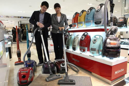 | 8일 롯데백화점 서울 소공동 본점 가전매장을 찾은 고객들이 청소기를 사용해 보고 있다. 롯데백화점 제공. |