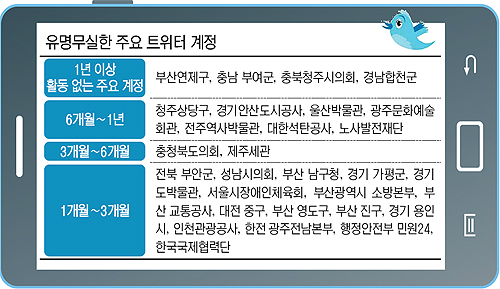 12일 세계일보 취재팀이 트위터에 ‘자치단체’로 등록된 계정 224개를 확인한 결과, 최근 한 달 이상 한 줄의 글도 올라오지 않은 계정은 33개에 달했다. 이 가운데 6개월 이상 활동이 없는 계정도 12개나 됐다. 1년 이상 글이 올라오지 않는 ‘휴면계정’도 충남 부여군(@buyeo_baekje), 경남 합천군(@hapcheongun) 등 4곳에 달했다.