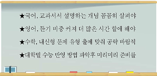 2014학년도 수능은 수험생의 수능 준비에 대한 부담을 줄이고, 학교에서 가르치는 내용과 수능에서 출제하는 내용이 일치되도록 교과 중심의 출제가 강화되므로 현재보다 내신이 더 중요해진다. 중간고사와 기말고사에서 출제됐던 주요 개념과 단원이 수능에서도 똑같이 출제될 가능성도 매우 높아졌다. 따라서 그동안 학생부 교과 공부와 수능 공부를 따로 준비해 오던 기존의 방식과는 달리 수능과 교과학습을 구분하지 않고 공부하는 새로운 학습형태가 필요하다. 학교 시험에서 출제된 문제 중에서 수능시험 문제로 다시 출제될 수 있는 문제들을 학습하되, 고난도 문항보다는 중간 난이도 문제를 중심으로 학습하는 게 좋다.