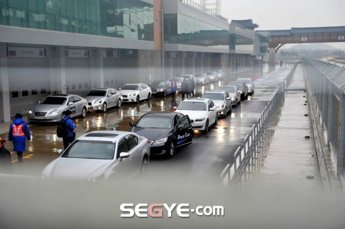| ▶ 비오는 날씨에 치러진 렉서스 GS 시승회. 렉서스 GS350 F-sport, GS350은 물론 경쟁모델로 지목한 BMW528i, 벤츠 E300도 비교 시승용으로 등장했다. 사진=이다일 기자 |