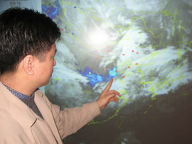 | 22일 기상청 이상삼 연구사가 천리안 위성 영상을 통해 황사 발원지와 이동 경로 등에 대해 설명을 하고 있다. 기상청 제공 |