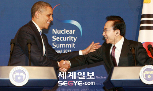 | 이명박 대통령이 25일 핵 안보정상회의(26, 27일)에 참석하기 위해 방한한 버락 오바마 미국 대통령과 청와대에서 정상회담을 마친 뒤 기자회견을 하던 중 밝게 웃으며 악수하고 있다. 남제현 기자 |