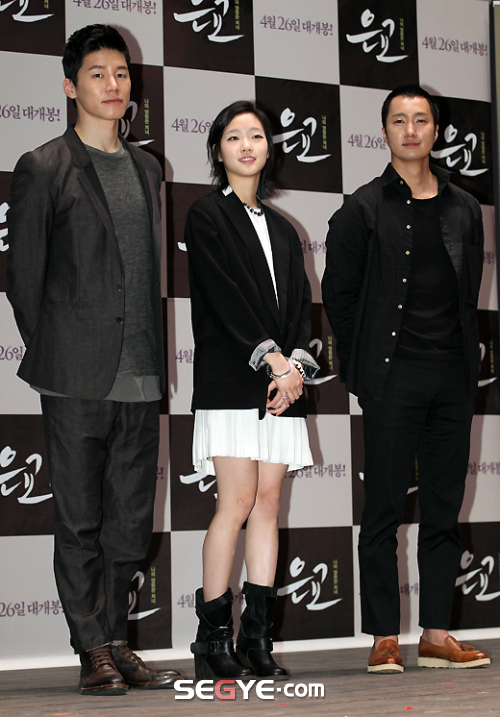 27일 오전 서울 롯데시네마 건대점에서 열린 영화 '은교' 제작보고회에 참석한 배우 김무열, 김고은, 박해일(왼쪽부터)이 포즈를 취하고 있다.