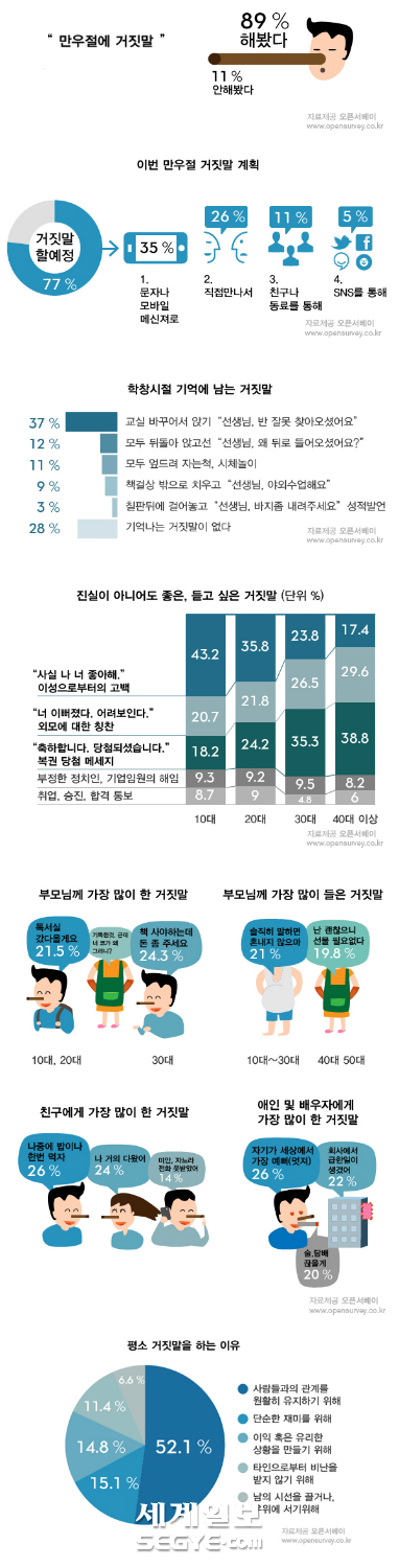 다가오는 만우절에 거짓말을 할 계획 여부에서, 전체 응답자 77%가 ‘거짓말을 할 계획'이라고 답했다. 이 중 거짓말을 할 방법으로는 ‘문자와 카톡으로 하겠다’가 가장 많은 비율인 35%을 차지했다. 이어서 가족 및 동료·친구에게 '직접 대면' 하여 거짓말 할 계획이 있다가 26%, ‘친구나 동료를 통해서’가 11%, 트위터나 페이스북과 같은 ‘SNS를 통해’가 5%로 나타났다.