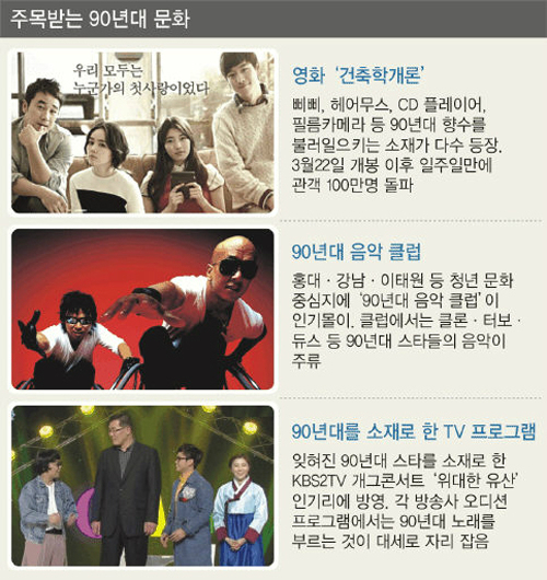 직장인 서원영(35)씨는 지난주 영화 ‘건축학개론’을 보고 나서 오래도록 추억에 잠겼다. 영화 속 삐삐와 헤어무스, 힙합바지, 필름카메라 등은 서씨가 대학에 다니던 시절의 모습 그대로였다. 1990년대를 배경으로 첫사랑의 추억을 그린 이 영화는 개봉 1주일 만에 100만 관객을 돌파하며 인기몰이 중이다.