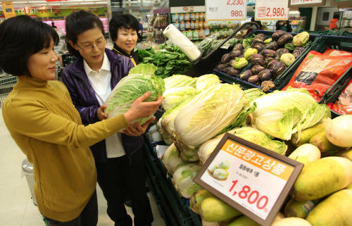 이마트는 오는 11일까지 봄맞이 해남 월동배추를 1800원에 판매한다, 5일 이마트 용산점에서 고객들이 월동배추를 고르고 있다. 지난 4일 가락시장 도매가 기준 46% 가량 저렴한 가격이다. 이마트 측은 2월 한파로 가격이 오르기 전 사전 대량 매입을 통해 월동 배추를 저렴하게 준비할 수 있었다고 설명했다.