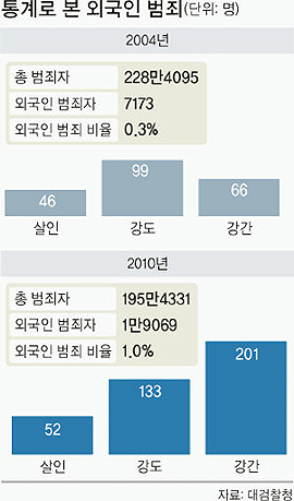 8일 법무부와 경찰 등에 따르면 2010년 들어 전체범죄 100건 가운데 1건은 외국인들이 저지른 것으로 나타났다. 특히 2010년 살인·강도·강간 등 강력범죄 중 외국인 비중은 1.3%로, 2004년의 0.4%보다 3배 이상 증가했다.