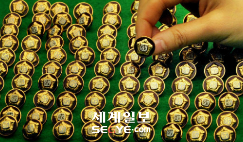 | 주인 기다리는 금배지 4·11총선을 이틀 앞둔 9일 국회 개원종합지원실이 공개한 제19대 국회의원 배지. 19대 국회는 세종특별시 지역구 신설로 의원수가 1명 늘어나 총 300개 배지가 제작됐다. 허정호 기자 |
