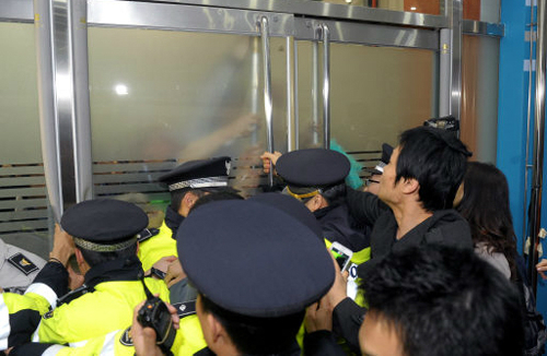 “개표 중지하라” 항의 서울 강남을의 정동영 민주통합당 후보 지지자 및 관계자들이 11일 오후 개표 중지를 요구하며 학여울 서울무역전시컨벤션센터(SETEC) 개표장 안으로 들어가려고 하고 있다. 이날 개표 과정에서 봉인 처리가 제대로 되지 않은 투표함 27개가 무더기로 나왔다.