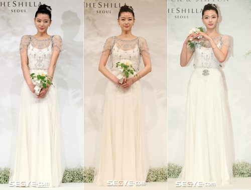 배우 전지현이 4월 13일 결혼식 직전 기자회견을 통해 웨딩드레스 자태를 최초 공개했다.