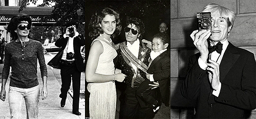 ‘파파라치의 제왕’으로 불리는 사진가 론 갈렐라가 자신이 포착한 유명인사들의 사진을 담은 사진첩 ‘탁월한 사진사’를 30일 발간한다. 여기엔 선글라스를 쓰고 미국 뉴욕 거리를 걸어가는 존 F 케네디의 영부인 재키 케네디, 미국 로스앤젤레스 슈리네극장에서 촬영한 가수 마이클 잭슨과 배우 브룩 실즈, 갈렐라의 팬이었던 예술가 앤디 워홀 등의 모습이 소개된다(왼쪽부터). 갈렐라는 유명인사들을 귀찮게 따라다니는 것으로 유명했다. 이에 재키 케네디는 소송을 통해 주변 50m 접근금지 명령을 받아냈다.