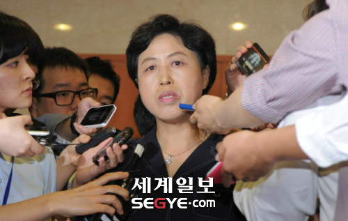 | 통합진보당 비례대표 1번 윤금순 당선자가 4일 국회 정론관에서 기자회견을 갖고 비례대표 후보 경선 부정 사태와 관련해 사퇴의사를 밝힌 뒤 기자들 질문을 받고 있다. 허정호 기자 |
