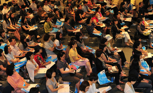 | 지난해 8월 입시업체가 주최한 대학 수시모집 설명회에서 학부모들이 강사의 설명을 듣고 있는 모습. 세계일보 자료사진 |