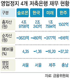 금융위원회가 6일 솔로몬·한국·미래·한주저축은행에 대해 영업정지 명령과 경영개선 명령을 내렸다. 이들 저축은행은 앞으로 45일 이내에 경영을 정상으로 되돌려놓지 못하면 퇴출의 길을 걷는다.