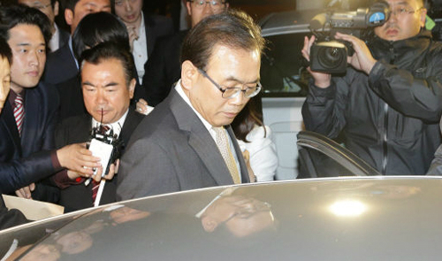 | 수감되는 박영준 파이시티 인허가 청탁 명목으로 금품을 받은 혐의로 사전구속영장이 청구된 박영준 전 지식경제부 차관이 법원에서 영장이 발부된 직후인 7일 오후 11시40분 서울 서초동 대검 청사에서 서울구치소로 가기 위해 차량에 타고 있다. 연합뉴스 |