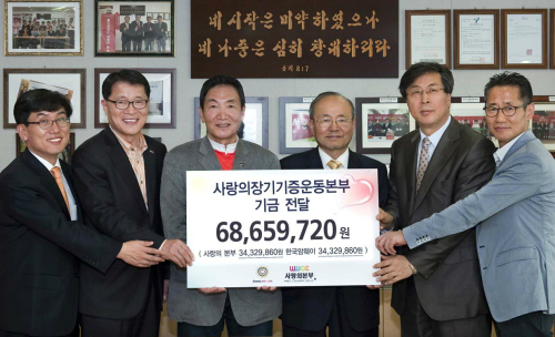 | 한국암웨이 사업자의 비영리법인인 ‘사랑의 본부’ 회원 4천여명은 장기기증을 서약하고, 모두 7천만원을 사랑의 장기기증 운동본부에 기부했다. 왼쪽부터 한국암웨이 이용일 전무, ‘사랑의 본부’ 김종수 부회장, 김일두 회장, 사랑의 장기기증 운동본부 박진탁 본부장, 한국암웨이 최광명 부사장, ‘사랑의 본부’ 류인익 리더.(사진=한국암웨이 제공) |