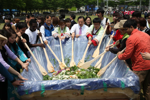 | 황선조 선문대 총장(가운데 넥타이 차림)이 외국인 재학생들과 함께 지역 어르신들께 대접할 비빔밥을 만들고 있다. 선문대 제공 |