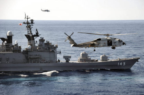 | 미·일 연합훈련에 참가한 일본 해상자위대 소속 헬리콥터와 구축함이 2010년 12월 태평양 인근 해상에서 이동하고 있다. 일본 시마네현이 독도와 가까운 오키섬 자위대 상주를 요청하면서 일본 정부의 대응이 주목된다. 세계일보 자료사진 |