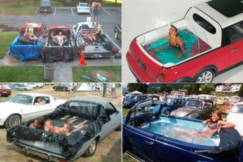 수영장이라기보다 마치 목욕탕 욕조처럼 보이는 이 차들은 픽업트럭을 개조해 적재함에 물을 채워넣었거나 일부는 시트를 모두 뜯어내고 물을 채워 넣었다. 네티즌들은 이 사진을 보고 “‘차(CAR)’와 수영장(POOL)’이 합해져 진정한 카풀 사진이다”라며 폭소를 터트렸다.