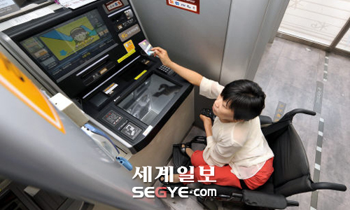 | 3일 서울 구로구 오류동의 은행 현금자동입출금기(ATM) 앞에서 휠체어를 탄 한 장애인이 카드를 넣기 위해 팔을 힘껏 뻗고 있으나 투입구 위치가 높아 애를 먹고 있다. 이재문 기자 |