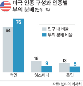 4일(현지시간) 소득 분석 전문업체인 ‘센티어 리서치’가 2008∼2010년 소득자료를 분석한 결과에 따르면, 미국에서 히스패닉을 제외한 백인이 차지하는 비율은 64%이지만 소득은 전체의 76%에 이른다. 5년 전 78%에서 2%포인트 줄어든 것이긴 하나 여전히 부의 축적이 백인에 편중돼 있음을 뜻한다.