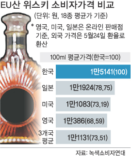 국내에서 유통되는 유럽연합(EU)산 위스키의 소비자가격이 수입가격의 5.1배나 되고, 미국·일본에 비해서도 30% 이상 비싼 것으로 드러났다. 작년 7월 한·EU 자유무역협정(FTA) 발효로 관세가 내렸음에도 위스키 가격은 되레 상승했다.