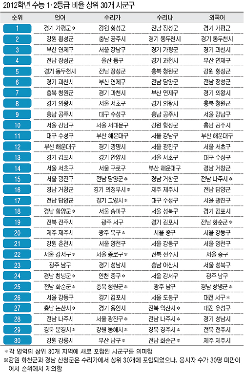 1·2등급 비율이 높은 시·군·구 대부분이 특목고 및 자사고가 있거나 해당 지역 중심 학군이었다. 경기 가평군(청심국제고)과 과천시(과천외고), 동두천시(동두천외고), 강원 횡성군(민족사관고), 충남 공주시(공주한일고), 전남 장성군(장성고) 등이 언·수·외 모든 영역에서 10위권 안에 들었다. 서울 강남·서초구, 부산 연제·해운대·남구, 대구 수성구, 광주 북구 등 대도시 지역의 중심 학군의 수능 최상위권 비율도 높았다.