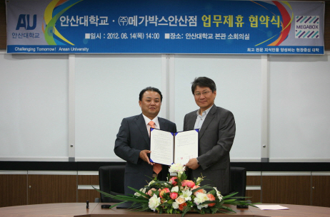 안산대학교(김주성 총장)는 14일 본관 2층 회의실에서 메가박스 안산점과 영화관 이용할인 혜택에 관한 업무협약을 체결했다.