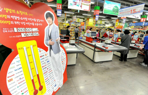 | 홈플러스 매장에 설치된 ‘생명의 쇼핑카트’ 캠페인 현황판. 홈플러스 제공 |
