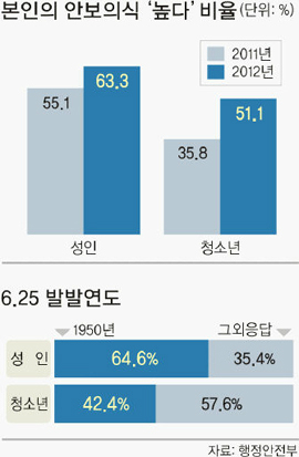북한 김정일 국방위원장 사망과 광명성 3호 발사 등 국가 안보를 위협하는 사건이 잇따르면서 국민의 안보의식이 높아진 것으로 나타났다. 하지만 청소년 10명 중 6명은 6·25전쟁의 발발 연도를 정확히 모른다고 답해 청소년들에 대한 안보교육이 시급한 것으로 조사됐다.