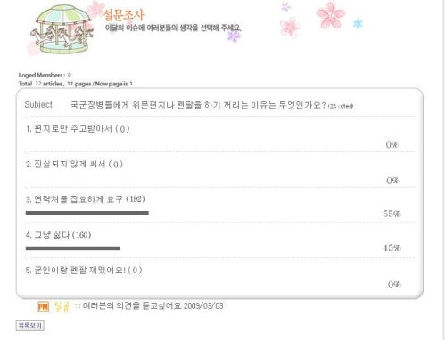 지난 2009년 한 인터넷 사이트에서 했던 설문조사가 다시 화제가 되고 있다. ‘국군장병과 펜팔을 꺼리는 이유’라는 제목의 다소 장난기 섞인 조사다.