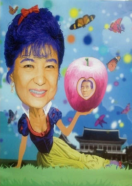 포스터는 가로 60cm, 세로 1m 크기로 박 전 비대위원장이 백설공주로 분해 아버지 고 박정희 전 대통령의 얼굴이 그려진 사과를 들고 앉아 있는 모습이다. 그림의 배경에는 청와대도 있다.