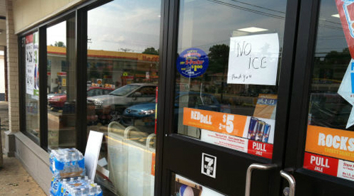 | “얼음 없어요” 1일(현지시간) 폭염 속에서 미국 워싱턴DC와 메릴랜드, 버지니아주 수백만가구가 사흘째 정전인 가운데 버지니아주 옥턴 시내 한 가게 앞에 얼음이 동났다는 안내판이 나붙어 있다. 옥턴=박희준 특파원 |