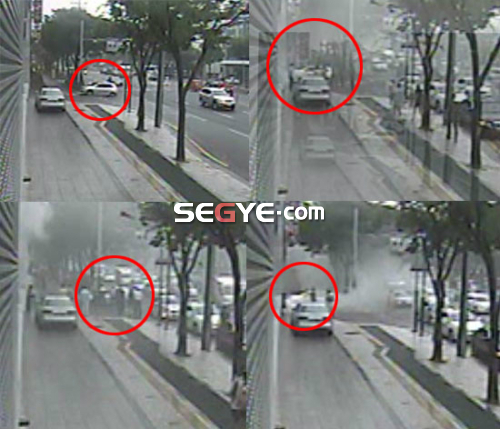 세계닷컴이 4일 입수한 CCTV 동영상에는 폴크스바겐 골프 운전자가 왕복 8차로에 유턴을 위해 대기중인 장면이 들어있다. 대기중이던 차는 직진 신호에 맞은편 차가 달려오는데도 무리하게 좌회전한다. 하지만, 차의 움직임은 정상적이지 않았다. 맞은편 차가 달려오는데도 서서히 인도로 들어가 벽을 들이받는다. 그러나 운전자는 차에서 내리지 못했다. 곧이어 차는 굉음을 내며 벽을 들이받고 흰 연기를 내뿜는다. 타이어가 헛돌기 시작했다. 이후 약 1분 30초간 차에서 내리지도 못한 채 가속페달을 밟고 있는 아찔한 상황이 이어진다.